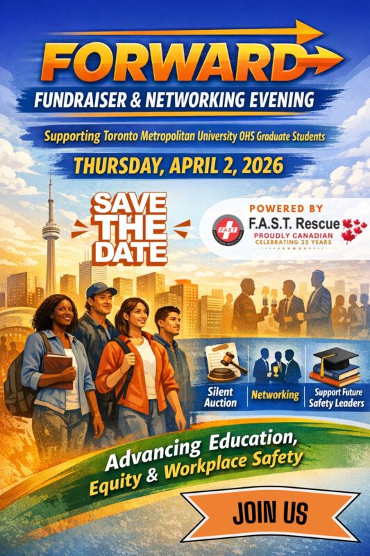 F.A.S.T. Rescue is proud to announce the Forward Fundraiser & Networking Evening on Thursday, April 2, 2026. This is our first fundraising event in support of students in the Toronto Metropolitan University Occupational Health & Safety Graduate Program. The event aims to raise money through sponsorships, attendance, and a silent auction, while engaging industry partners, community members, and supporters who share a commitment to workplace health, safety, and public service.